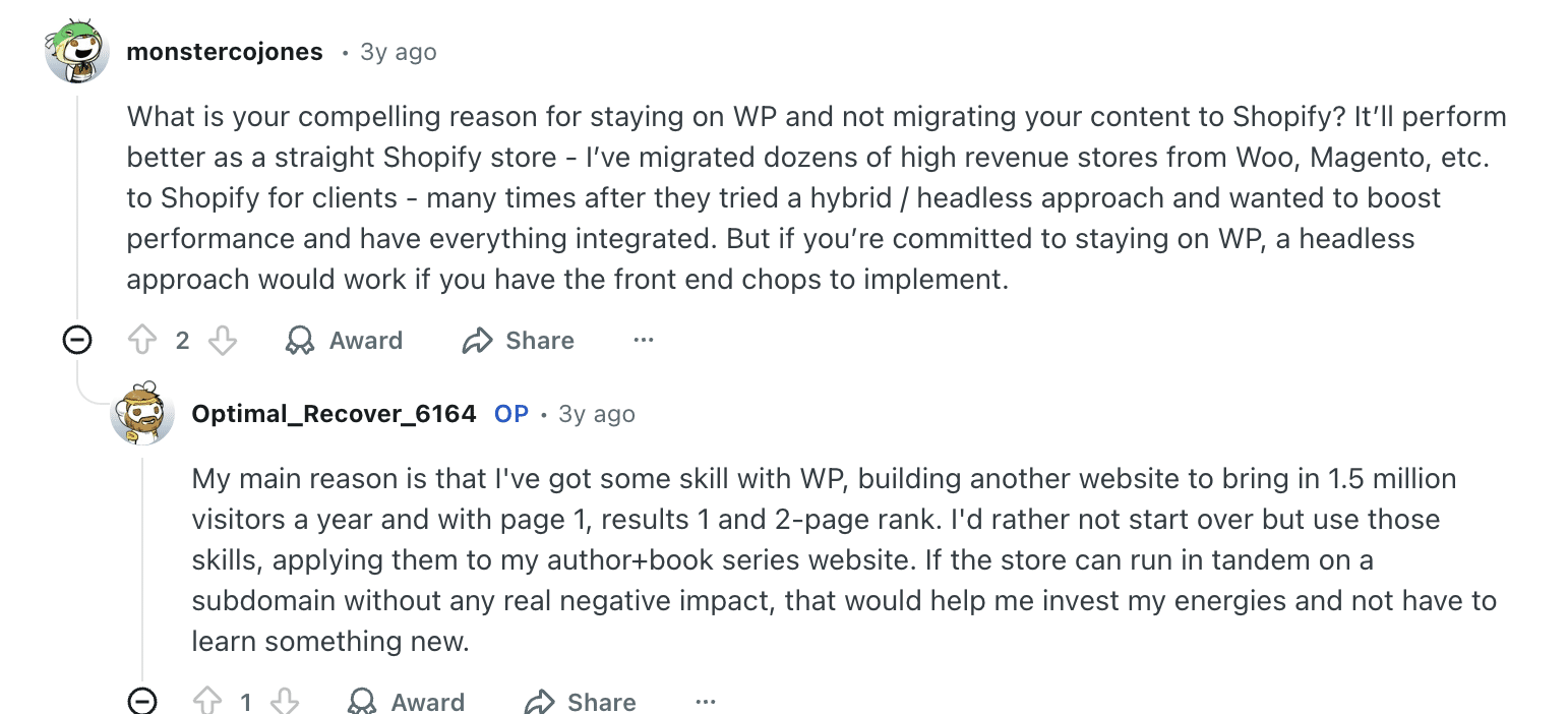 Check out the full Subreddit to see why many stay on WordPress but sell with Shopify »